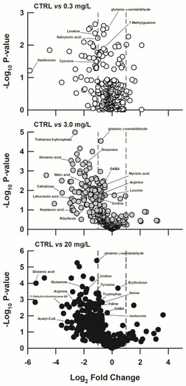 Volcano plots showing several differential hepatic metabolites between the CTRL and 0.3 mg/L, between the CTRL and 3.0 mg/L, and between the CTRL and 20 mg/L ammonia-exposed group of Trachemys scripta elegans juveniles.