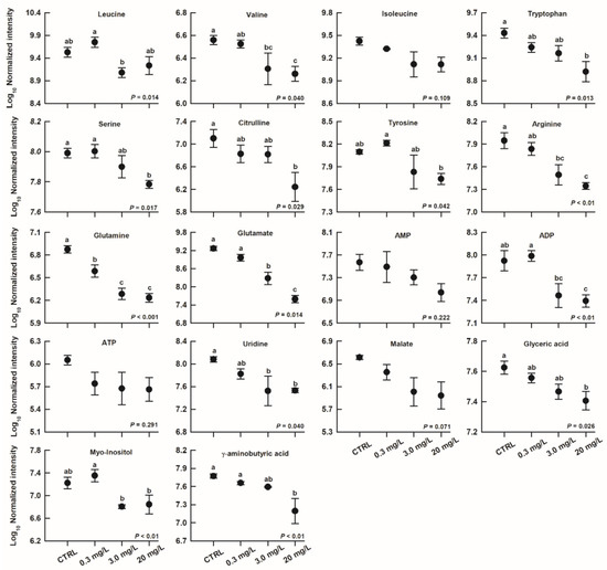 Compared with the CTRL group, 61, 125, and 166 metabolites changed remarkably in the 0.3, 3.0, and 20 mg/L ammonia-exposed groups, respectively (Figure 5). Some differentially expressed metabolites at different ammonia concentrations were identified, and these metabolites were primarily involved in amino acid metabolism (such as leucine, valine, tryptophan, serine, citrulline, arginine, glutamine, glutamate, etc.). These amino acids decreased somewhat with increasing ammonia concentration (Figure 6). Similarly, hepatic adenosine diphosphate (ADP), uridine, glyceric acid, myo-inositol, and γ-aminobutyric acid levels also decreased when exposed to high levels of ammonia concentration (Figure 6).