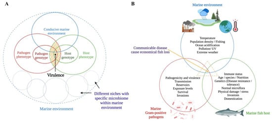 Schematic representations of (A) how virulence is modulated in a dynamic host–pathogen interaction [21] (the yellow shaded area expresses virulence as an outcome of a dynamic host-pathogen interaction in a conducive marine environment) and (B) how the disease process occurs as a result of complex host-pathogen-environment interactions. This figure was generated by the authors using BioRender (https://biorender.com/) (accessed on 1 August 2022).