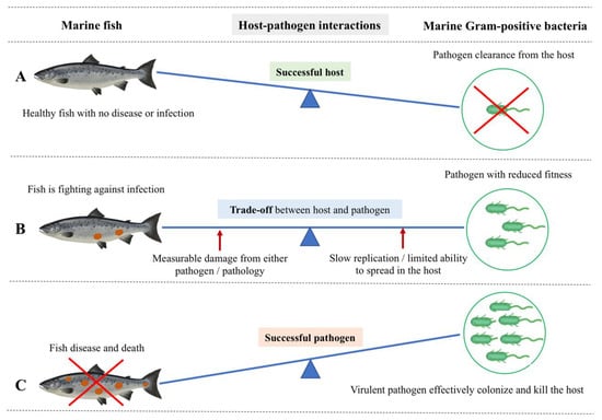 Host-centric and pathogen-centric views of dynamic host-pathogen interactions between marine Gram-positive bacteria and a marine fish host. (A) Successful host: Fish show no disease or infection because of successful pathogen clearance by the host-induced pathogen-specific immune response. Therefore, fish stay healthy, with effective immunological and physiological homeostasis upon an infection event. (B) The trade-off between host and pathogen: It is the actual tug-of-war scenario between the fish host and pathogen. Here, the fish is still alive but fighting against the infection with an initiated specific immune response. In this trade-off, the pathogen compromises its fitness, thereby slowly replicating without alerting the fish immune response and exploiting the fish host without killing it. On the other hand, the fish is measurably damaged as a result of either the pathogen’s action or a host-specific pathology. There is a scenario where increased acquisition and allocation of nutrients occur at the host/pathogen nutritional interface as opposed to a trade-off. Here, the host withdraws an essential nutrient supply to suppress pathogen proliferation while increasingly allocating the nutrients to fuel immune proliferation. The pathogen, on the other hand, gradually acquires host nutrients to fuel its own replication and survival. (C) Successful pathogen: A virulent pathogen effectively colonizes using host resources and killing the host by successfully escaping the barriers of the fish host’s innate and adaptive immunity, leaving and infecting a new host. Therefore, the fish shows severe disease and death.