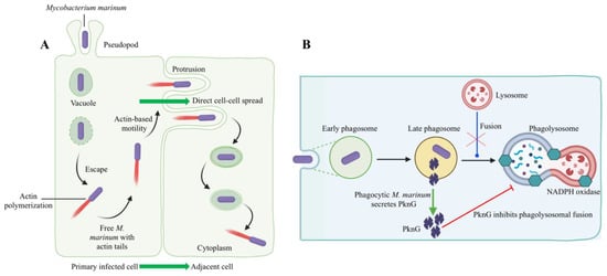 Host–pathogen interactions during intracellular evasion strategies of M. marinum. M. marinum has been shown to use two methods to evade phagocytic killing: (A) Escape from phagosomes into the cytosol and cell-to-cell spread via actin-based motility [123]. The initial uptake of M. marinum into phagocytic vacuoles is followed by an escape from vacuoles into the cytoplasm. According to Stamm et al. (2003), M. marinum polymerized actin through the recruitment of host cell cytoskeletal factors in the cytoplasm [112]. Thus, free M. marinum with actin tails was observed in the host cell cytoplasm. The acquisition of actin-based motility allows M. marinum to spread cell to cell directly from primarily infected cells to adjacent cells without leaving the cytoplasm. (B) M. marinum blocks phagolysosomal fusion (late phagosome fused with phagocytic lysosome), thus resisting the discharge of lysosomal contents into the phagosome. Here, protein kinase G (PknG) secretion through the SecA2 pathway is initiated by phagocytic M. marinum. Secreted PknG directly inhibits the fusion of late phagosomes with lysosomes. This original illustration was generated by the authors using BioRender (https://biorender.com/) (accessed on 16 November 2021).