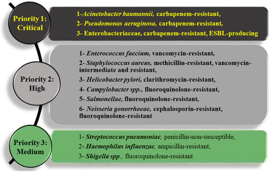 - World Health Organization. WHO Publishes List of Bacteria for Which New Antibiotics Are Urgently Needed. Available online: https://www.who.int/news-room/detail/27-02-2017-who-publishes-list-of-bacteria-for-which-new-antibiotics-are-urgently-needed (accessed on 9 March 2020).