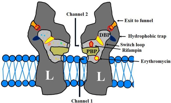 Schematic diagram depicting drug pathways in AcrB and the drug-binding pockets and the two channels that transport substrates are depicted. The periplasmic entry site (channel 2) includes the proximal binding pocket (PBP) in the L protomer, while channel 1 guides substrates from the inner membrane leaflet. The binding sites for rifampicin and erythromycin, co-crystallized in the access pocket in the L monomer, are shown. Minocycline and doxorubicin bind in the deep binding pocket within the T monomer (not shown). The switch loop that separates the proximal and distal binding pockets is also shown. Moreover, the schematic diagram shows the proximal and distal binding pockets of AcrB and a switch loop that separates them, which assists in the unidirectional movement of substrates, whereas smaller substrates and low-molecular-mass drugs localize in the deeper DBP. The two entry channels for substrates connect together leading to the distal binding pocket shown, as is the exit channel that leads from the central cavity to TolC.
