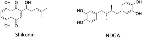 Chemical structures of the phytochemicals shikonin and NDGA.