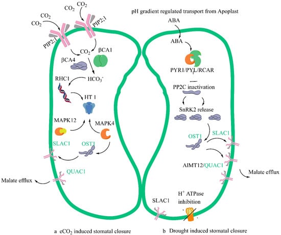 A simplified model of stomatal closure effected by eCO2 (a) and ABA (b) with commonality and convergence in the mechanism shown in green. Several Aquaporins felicitate the entry of CO2 in guard cells. Plasma membrane intrinsic protein (PIP2;1) aquaporin that facilitates water transport across the cell membrane and carbonic anhydrases (b CA4 and b CA1) interact leading to the in-creased formation of Bicarbonate (HCO3−). The multidrug and toxic compound extrusion (MATE)-type transporter RESISTANT TO HIGH CARBON DIOXIDE 1 (RHC1) gene product senses HCO3 signalling. Carbon Dioxide and Bicarbonate together act as signal transduction molecules. Under eCO2 the possible action would be the activation of MPK12 and MPK 4 resulting in the inhibition of expression of protein kinase HIGH LEAF TEMPERATURE1 (HT1). When ABA enters the guard cells, in the ABA-mediated closure PYRABACTIN RESISTANCE1 (PYR1)/PYR1-LIKE (PYL)/REGULATORY COMPONENTS OF ABA RECEPTORS (RCAR) it interacts with Type 2C protein phosphatases (PP2Cs) and inhibits them. The proton translocating ATPase is inhibited in the process by ABA and this prevents proton entry into the guard cells and regulates its pH. There is a subsequent release of Ca2+-independent protein kinases (SnRK2s). SLAC1 ion channel is phosphorylated by the activation of SnRK2 and calcium dependent protein kinases (CPK). The convergence step under both eCO2 and ABA is the activation of Rapid type ion channel aluminium-activated malate transporter 12/quickly activating anion channel 1 (ALMT12/QUAC1) which leads to the turgor dynamics and K+ ion efflux and resultant stomal closure.