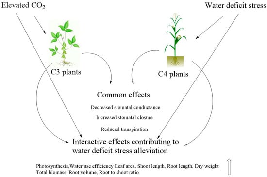 Schematic representation of individual and interactive effects of water deficit stress and eCO2 in C3 and C4 plants.