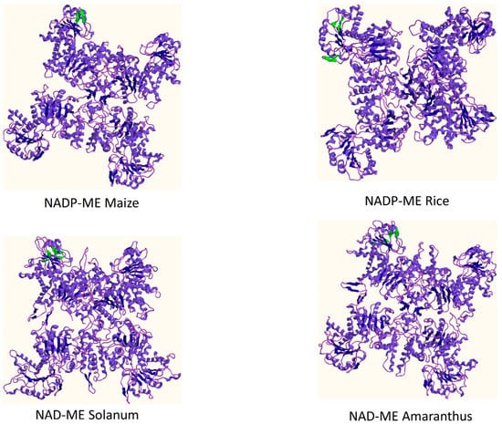 In the NAD-ME type plants, the enzyme has the main function of decarboxylation of malate to produce pyruvate, NADH and CO2; this enzyme uses NAD+, does not decarboxylate Oxalo Acetic Acid (OAA) and is present in mitochondria. Drought and C4 enzymes, specifically the NAD and NADP malic enzyme action dynamics, have been well studied [14,67,69,70]. The possible mechanism can be that the entry of CO2 is restricted under eCO2 conditions due to reduction in stomatal density and closure, either due to eCO2 or drought; the ME in C4 can contribute to higher accumulation of CO2 in the bundle sheath cells, thus increasing photosynthesis, and in contrast to the commonly accepted view that C4 plants do not have a distinct advantage under eCO2 conditions. There is also evidence that ME has an important role in balancing out malic acid and decreasing the Reactive Oxygen Species (ROS) generation, thereby offering protection against oxidative damage [71]. Considering all these aspects of Malic Enzymes, we did a sequence search, alignment, and homology modelling of four different kinds of MEs to understand if there are possible structural differences in these different enzymes that can explain the functional diversity. It was seen that there were differences in the protein secondary structure (Table 1), and distinct hairpin bend differences in the structure of the enzyme (Figure 3).