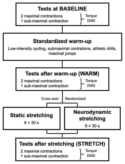 The immediate effects of stretching modalities on the neuromuscular system (and more particularly of static stretching) are frequently investigated in the literature. Most techniques target the muscle–tendon complex and less is known on techniques focusing on the neural tissue. For instance, the neurodynamic nerve gliding is a technique used in clinical practices that aims to restore the dynamic balance between the relative movement of neural tissues and the surrounding mechanical interfaces [15]. In a recent study, authors have demonstrated that the neurodynamic nerve gliding technique had slightly greater effects on hamstring stiffness than static stretching in physically active men [16]. Similar or greater increases in range of motion have been observed with acute or chronic use of nerve-oriented stretching (such as neurodynamic nerve gliding) as compared to the other techniques [17,18,19,20]. The larger effects were likely due to a decreased nerve tension and increased strain in connective tissues [16]. However, to the best of our knowledge, no study has explored whether neurodynamic stretching could be included in warm-up routines.