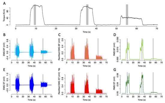 Figure 2. Torque and electromyography (EMG) traces for biceps femoris (B,F) and semitendinosus (ST) during maximal and sub-maximal contractions for a representative volunteer. Torque (A), raw EMG (B,E), filtered and rectified (EMG)(C,F) and root mean square (RMS; (D,G)). During maximal contractions and sub-maximal contractions, 1 s windows were considered for analyses (gray area).