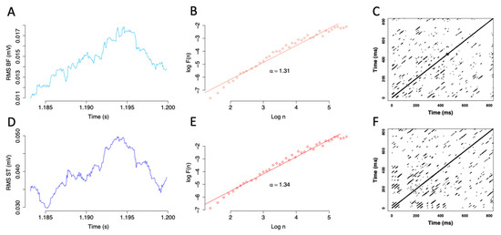 Figure 3. Electromyography (EMG) linear and non-linear analyses for biceps femoris ((B,F), upper panel) and semitendinosus (ST, lower panel) during a maximal contraction for a representative volunteer. Sliding root mean square (RMS; (A,D)), detrended fluctuation analysis (D,F,A) with the associated a scaling parameter (B,E), and recurrence quantification analysis (RQA; (C,F)).