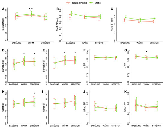 Figure 4. Torque (A), root mean square (RMS; (B,C)), sample entropy (SampEn; (D,E), a scaling parameter (F,G), percentage of recurrence and determinism (%Rec and %Det; (HK)) for biceps femoris and semitendinosus muscles (BF and ST, respectively) during maximal voluntary contractions. Values are mean ± standard deviation. *: significant difference with respect to BASELINE, °: significant difference with STRETCH (p < 0.05).