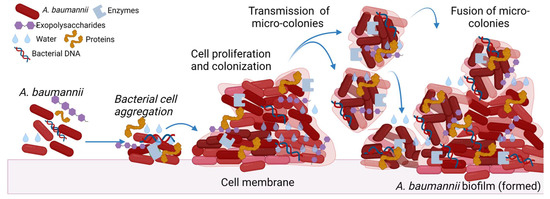A. baumannii biofilm formation. The figure was made with www.biorender.com (accessed on 25 July 2022).