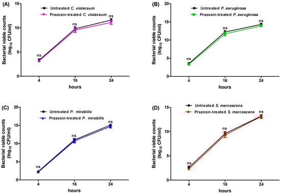 Effect of prazosin on the growth of (A) C. violaceum, (B) P. aeruginosa, (C) P. mirabilis, and (D) S. marcescens. There were no significant differences between the viable counts of untreated cultures and prazosin-treated cultures. ns: non-significant.