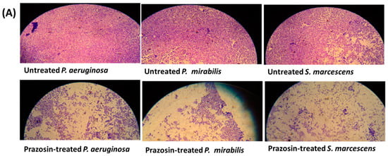 Strong biofilm-forming bacterial strains P. aeruginosa, P. mirabilis, and S. marcescens [18] were used to evaluate the prazosin anti-biofilm activity. The crystal violet method was employed to evaluate anti-biofilm activity, and the absorbances of extracted crystal violet at 600 nm [31]. Briefly, bacterial suspensions of tested strains were prepared from fresh overnight cultures and their optical densities were adjusted to OD600 of 0.4 (1 × 108 CFU/mL). Ten μL aliquots of prepared suspensions were mixed with 1 mL of fresh Tryptic soy broth (TSB) in the presence or absence of prazosin at sub-MIC. TSB aliquots (100 μL) with and without prazosin were transferred into the wells of 96-wells microtiter plate and incubated at 37 °C for 24 h. The planktonic cells were aspirated and the wells washed several times with distilled water and left to air dry. The adhered cells were fixed with methanol for 25 min and stained with crystal violet (1%) for 25 min. The wells were washed, the attached dye eluted by 33% glacial acetic acid, and the absorbance measured. The prazosin anti-biofilm activity was visualized by allowing the formation of bacterial biofilms on cover slips in the presence or absence of prazosin, as described earlier [21]. The same procedure as described above was followed except that the biofilms of the tested strains were formed on glass slides placed in polystyrene petri plates in the presence and absence of prazosin at sub-MIC. Light microscope images were captured for the formed biofilms in the presence or absence of prazosin using a Leica DM750 HD digital microscope (Mannheim, Germany).