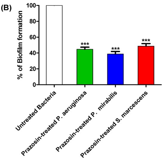 Bacteria biofilms are membrane attached communities in which polymer matrixes mainly composed of polysaccharides are produced to hold bacteria together [6,20]. Bacteria resist environmental stress by formation of biofilms in which the bacterial resistance to antibiotics is augmented in comparison to planktonic bacterial cells. So, the bacterial biofilm formation constitutes an additional obstacle, and their eradication from animate or inanimate objects is an essential requirement for efficient antibiotic treatments [6]. QS plays the crucial role in the formation of bacterial biofilms and targeting QS results in diminishing their formation [43]. The tested strains P. aeruginosa, P. mirabilis [28], and S. marcescens [52] were documented as strong-biofilm forming. Interestingly, prazosin significantly diminished the biofilm formation in the three tested strains.
