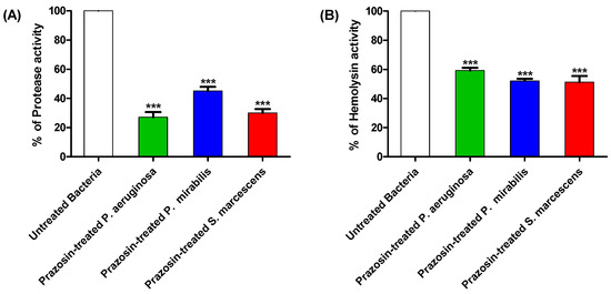 QS modulates the production of diverse virulence extracellular enzymes like lipase, protease, elastase, hemolysins, urease, and other virulence factors [14]. The production of these enzymes facilitates the spread and establishment of bacterial infections into host tissues [21,54,55]. For instance, proteolytic and hemolytic activities significantly enhance bacterial pathogenesis [54,55]. Prazosin significantly decreased P. aeruginosa, P. mirabilis, and S. marcescens production of hemolysins and proteases. In agreement with the in vitro phenotypic prazosin anti-virulence activities; prazosin at sub-MIC showed a significant reduction in the killing capacity of P. aeruginosa, P. mirabilis, and S. marcescens, protecting the tested mice.