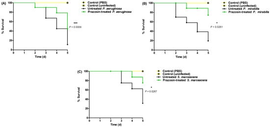Prazosin protected mice against virulence of (A) P. aeruginosa, (B) P. mirabilis, and (C) S. marcescens. Prazosin showed significant ability to protect the mice from P. aeruginosa, P. mirabilis, and S. marcescens pathogenesis (the log rank test for trend p = 0.0009, 0.0261, and =0.0267, respectively).