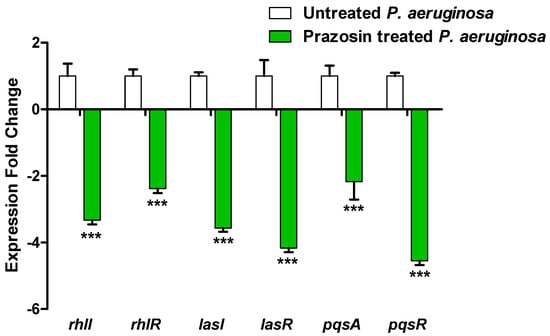 In control untreated P. aeruginosa and in P. aeruginosa treated with prazosin (at sub-MIC), the expressions of the P. aeruginosa QS-encoding genes LasI/R, RhlI/R, and PQS were assessed. When compared to the control untreated culture, the expression levels of the genes encoding the autoinducers lasI, rhlI, and pqsA and their receptors lasR, rhlR, and pqsR were markedly downregulated (Figure 6).