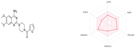 Physicochemical descriptors of prazosin; LIPO (lipophility): −0.7 < XLOGP3 < +5.0, SIZE: 150 g/mol < MV < 500 g/mol, POLAR (polarity): 20 Å2 < TPSA < 130 Å2, INSOLU (insolubility): −6 < Log S (ESOL) < 0, INSATU (insaturation): 0.25 < Fraction Csp3 < 1, FLEX (flexibility): 0 < Num. rotatable bonds < 9.