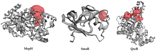 Cartoon representation of the binding site topology at the three bacterial targets, Putative pockets; red color, were calculated via the on-line Computed Atlas of Surface Topography of proteins (CASTp; http://sts.bioe.uic.edu/castp/index.html, accessed on 30 May 2022).
