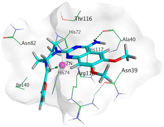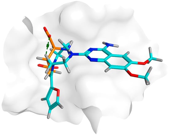 A 3D prazosin-S. marcescens SmaR model interaction diagram, prazosin is in cyan thick sticks within the molecular surface of the active site, amino acid residues of the active site are shown as green thin sticks. Pi-bond is presented as cyan dots.