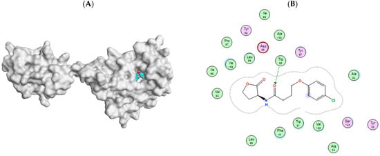 S. marcescens Quorum-sensing transcriptional regulator (SmaR) (Uniprot Entry: Q14RS3, www.uniprot.org; accessed on 4 May 2022) was identified as a target sequence. C. violaceum CviR transcriptional regulator (PDB: 3QP5, 3.25 Å) served as a template [37], as predicted using SWISS model (https://www.expasy.org/resources/swiss-model, accessed on 25 May 2022) [38,39,40,41,42]. C. violaceum CviR transcriptional regulator is the top-ranked template according to the sequence identity from seven suggesting templates. The binding site in the SWISS model was located by the site finder module in the MOE which matched the co-crystallised ligand (HLC) binding site of the template. Moreover, CASTp was used to verify the binding pocket.