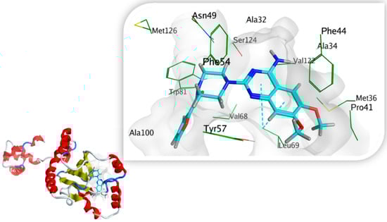 PubChem database (https://pubchem.ncbi.nlm.nih.gov/; accessed on 4 May 2022) was used for retrieving the prazosin SMILES string. Over drug repurposing, the compound went through the complete consequence of the drug development cycle [33]. SWISSADME tool (https://www.expasy.org/resources/swissadme; accessed on 4 May 2022) was used for analysis of the prazosin for molecular properties. The compound energy was minimized to 0.1 Kcal/mol/Å2 gradient RMS on Molecular Operating Environment (MOE 2019.012) for the docking process.