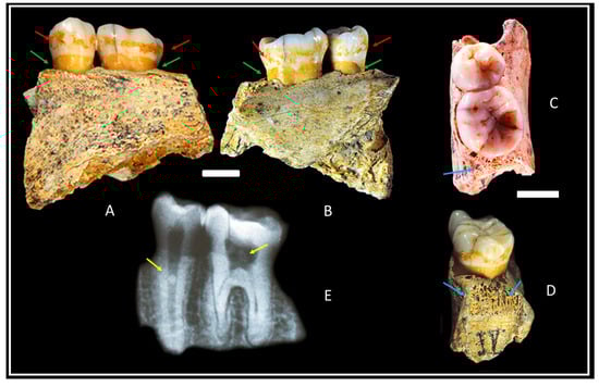 The alveolar arch (Figure 1 green arrows) displays a slight degree of resorption and is separated from the tooth cement–enamel junction by 2.5/3.02 mm. The loss of osseous mass and the alveolar destruction can also be seen in the radiograph (Figure 1E), showing a pathology that seems to be the result of incipient periodontal disease. This slight exposure of roots, especially if we consider the lack of conjunctive tissue, varies between 1.0 and 1.5 mm in height [17]. Both preserved teeth on Combe-Grenal IV show supragingival tartar deposits (Figure 1 red arrows) forming a wide band around the crowns, separated by 5/7 mm from the alveolar margin. As in degree 2 on the Brothwell [18] scale, and, according to the classification of periodontal diseases [19], they correspond to stage I (early–mild) and nearly stage II (moderate).