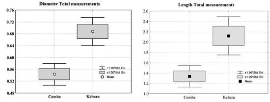 In Figure 4, the “Box and Whisker Plot” shows the differences obtained for the total dimensions of Combe-Grenal IV and Kebara 2 bacteria, with the former (Figure 4, left) corresponding to the diameter and the latter (Figure 4, right) to the length. On both graphs appear the mean values and the variation range of ± 1 and 1.96 standard errors. The differences between the total values obtained for both fossil individuals (Table 3) are statistically significant, particularly those comparing the diameters (p < 0.001), indicating larger dimensions of the bacterial flora on the adult male Kebara 2 than on the juvenile Combe-Grenal IV.