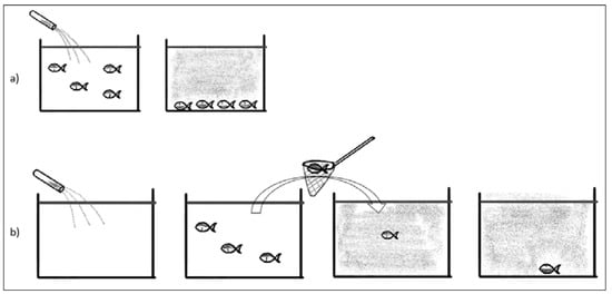 (a) Showing anesthesia solution directly into home tank. All fish will be anesthetized. (b) Individual fish are restrained and moved directly to the anesthesia bath.