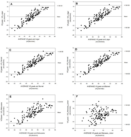 The Bland–Altman plots presented in this study (Figure 1) showed evidence of differences between the measured VO2peak and the predicted VO2peak values. It did not appear to consistently under/overestimate in the unfit/fit children with Equation #21, whereas this trend was evident with Equations #1, #4, and #6. For those, it can be said that for lower VO2peak values, the equation tends to overestimate the measured values, while for higher VO2peak values, the equation tends to underestimate the measured values. Only the plots regarding Menezes-Junior et al. [1] showed a random error which suggested a normal distribution of the differences between the methods, while the other plots presented a positive linear distribution of the values.