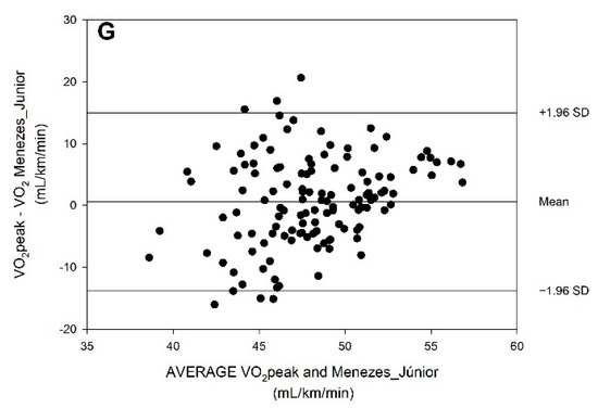 Bland–Altman plots regarding the measured VO2peak values and the predictive equations predicted VO2peak values: (A) Leger et al. (1988), Equation #1, with PGA; (B) Leger et al. [42], Equation #1, without PGA; (C) Barnett et al. [20], Equation #4, with PGA; (D) Barnett et al. [20], Equation #4, without PGA; (E) Matsuzaka et al. [18], Equation #6, with PGA; (F) Menezes-Junior et al. [1], Equation #21, with PGA; (G) Menezes-Junior et al. [1], Equation #21, without PGA.