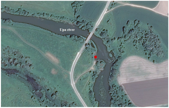 The river drainage basin is located in a cold temperate climate at an elevation of 159 m above sea level. According to the Koppen–Geiger climatic classification, the studied section of the Upa River basin is located in the humid continental (Dfb) climatic zone characterized by dry seasons and hot summers [46]. The annual precipitation is around 703 mm. The difference in precipitation between the driest and the wettest month is 45 mm. The average annual temperature is 5.9 °C. The temperature varies by 27.8 °C throughout the year [47].