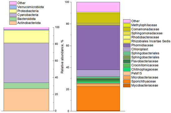 The rest of the bacterial diversity of water samples identified by high-throughput sequencing was represented by heterotrophic (organotrophic) microorganisms. Representatives of Actinomycetota, Pseudomonadota, and Bacteroidota utilize organic metabolites and polysaccharides produced by cyanobacteria, eukaryotic algae, and higher plants [51,52,53].