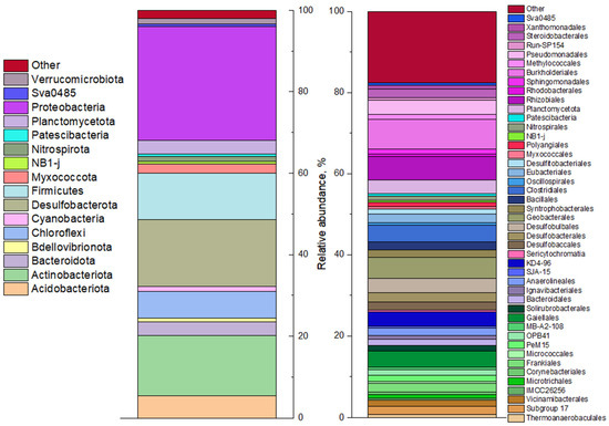 The microbial diversity analysis results of bottom sediment based on 16S rRNA gene sequencing are shown in Figure 3 and Figure S3. The sulfur cycle anaerobic microorganisms dominated the sample, including sulfate-reducing bacteria of the phylum Desulfobacterota (20%), representatives of the Firmicutes (including sulfate-reducing genera Desulfotomaculum, Desulfosporomusa, Desulfosporosinus, Thermodesulfobium) are known. A number of representatives of the classes Alphaproteobacteria (9%) and Gammaproteobacteria (19%) in the phylum Pseudomonadota (including Thiomonas, Thiobacillus, and Sulfuritallea) are capable of dissimilatory and assimilatory sulfate reduction, as well as oxidation of reduced forms of sulfur. It is important to note the presence of bacteria of the genus Pseudomonas in the bottom sediment sample. These bacteria are known for their ability to use a wide range of inorganic electron acceptors, including nitrate, arsenate, uranyl, and selenite [54,55,56]. Of the 16S rRNA sequences, 21% were attributed to mitochondria of eukaryotic aquatic organisms. No cyanobacterial genes were found, likely due to their destruction by the anaerobic microbial community upon ingestion into the bottom sediment.