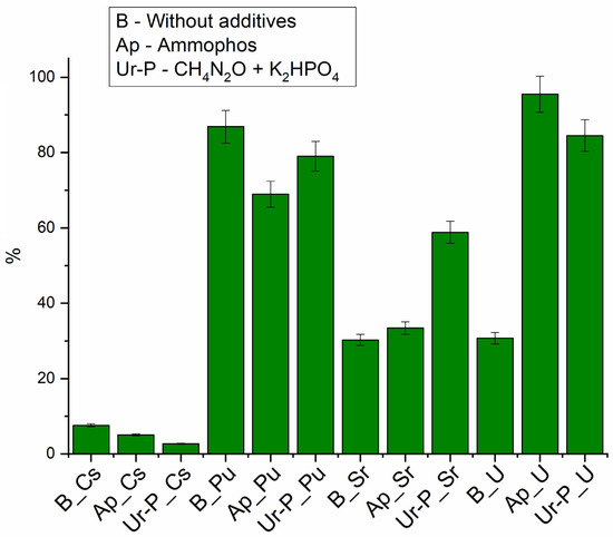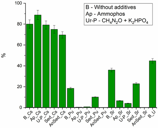 Without the addition of growth promoters (Figure 4), the maximum removal rate was observed for plutonium (up to 90%), due to its ability to hydrolyze at pH 7 and to form suspensions [57]. Sr and U removal did not exceed 40%, and Cs removal was less than 10%.