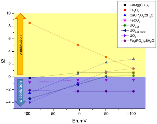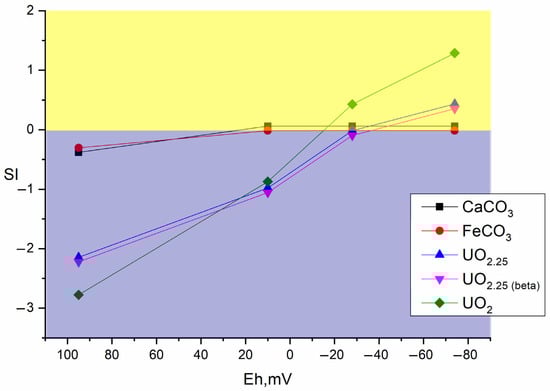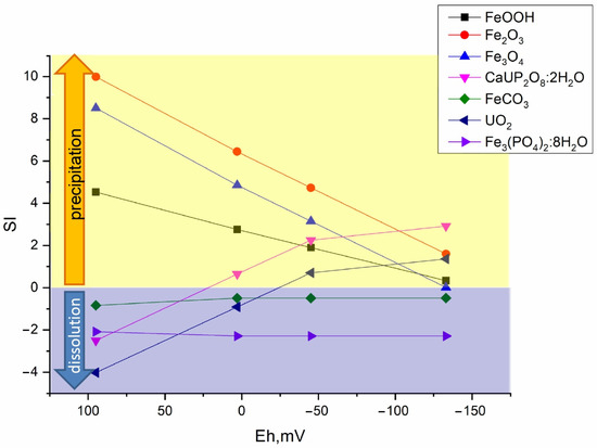 The saturation indices for the solid mineral phases of the studied radionuclides were assessed in modeling. The saturation index, SI, is the difference between decimal logarithms of current products of the ionic activity of the i-th phase and the solubility constant of the relevant mineral: