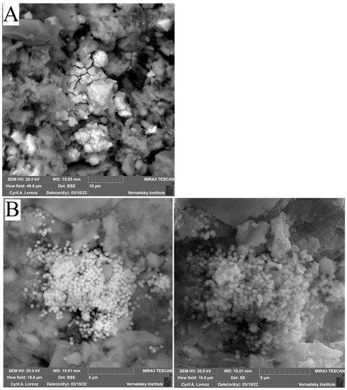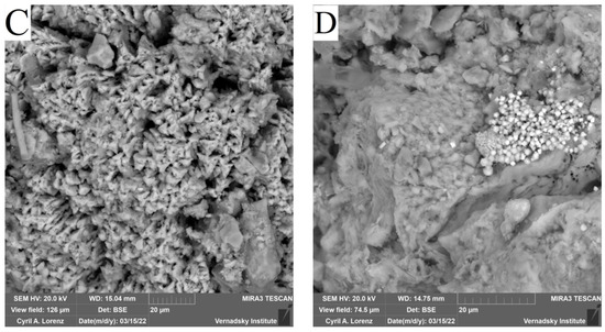 Electron microscopy was performed using a TESCAN MIRA3 FEG-SEM scanning electron microscope from the Joint Use Center, Vernadsky Institute of Geochemistry and Analytical Chemistry, Russian Academy of Sciences. For SEM analysis, samples were placed on an aluminum holder with an electrically conductive tape, and vacuum carbon deposition (Q150T E Plus) (vacuum 4−3, current 50 A) was performed. The samples were captured in two modes, SE and BSE, at a voltage of 20 kV.