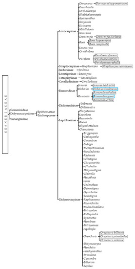 Didymocarpoideae is divided into two tribes: Epithemateae and Trichosporeae. Species in Epithemateae are thought to be relicts from an enormously diversified group that suffered a number of extinctions, which resulted in a few isolated genera with unusual and marked morphological characteristics. Trichosporeae has typically been the larger and more complex tribe, giving rise to uneven large groups. This has entailed a deep reconstruction of the subfamily that is still in process, allowing more homogeneous species classification [1,13,14,15]. Some genera have been newly established (Billolivia, Michaelmoelleria, Chayamaritia, Glabrella, Microchirita, Middletonia, Rachunia, Somrania) or recovered (Dorcoceras, Loxocarpus), while others have gained species from other genera (Damrongia, Oreocharis, Loxostigma, Deinostigma, Paraboea, Primulina, Streptocarpus), lost species by relocation to other genera (Boea), or lost species by synonymization (Acanthonema, Hovanella, Colpogyne, Linnaeopsis, Nodonema, Schizoboea, Briggsia) [13,16,17,18,19,20,21,22,23,24,25,26,27,28].