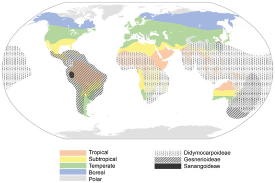 World climatic areas and distribution of the three Gesneriaceae subfamilies.