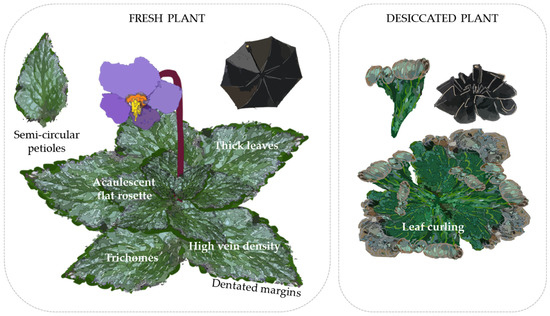 As a result, gesneriads growing in mountainous regions need to overcome a great variety of extreme conditions, which leads to a complex relationship among morphological features. Thus, temperate zone DT and FT gesneriads have been found to be perennial, slow-growing, small acaulescent plants with flat compact rosettes. Plant compaction involves a small leaf area with great dry matter content per area and thickness, which, along with trichomes, gives the plant a coarse touch. High vein density and narrow veins are also indispensable for hydraulic and mechanical support, the latter aided by a petiole in semi-circular cross-section and dentated margins (Figure 4). However, this pattern does not entirely adjust for species in areas susceptible to drought that lack freezing stress, as they exhibit more subtle morphological characteristics: they tend to have less compact acaulescent rosettes with longer and less coarse leaves (possibly due to lower dry matter content) and more longitudinal vein patterns. Therefore, differentiation between resurrection and non-resurrection morphology is not always clear, and the morphology described for double tolerance will be mainly considered for species proposal.