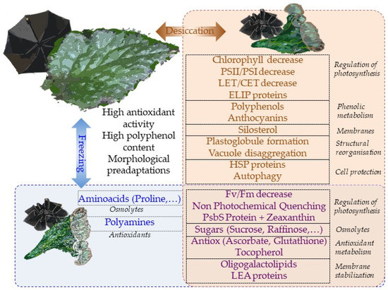 A summary of the main mechanisms of tolerance to desiccation and freezing in gesneriads. Brown box includes the responses to desiccation while blue box contains the mechanisms activated in response to freezing. The intersection between both boxes contains the mechanisms which are common to both stresses. Constitutive traits of gesneriads that might favor cross-tolerance are shown out of both boxes. The foldable umbrella analogy is depicted in the background.
