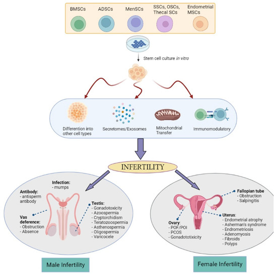 The possible mechanism of actions of bone-marrow stem cells (BMSCs), adipose tissue stem cells (ADSCs), menstrual stem cells (Men-SCs), endometrial MSCs, and germline-derived stem cells: spermatogonial stem cells (SSCs), oogonial stem cells (OSCs), and thecal stem cells in treating various male and female infertility problems (Created with Biorender.com).