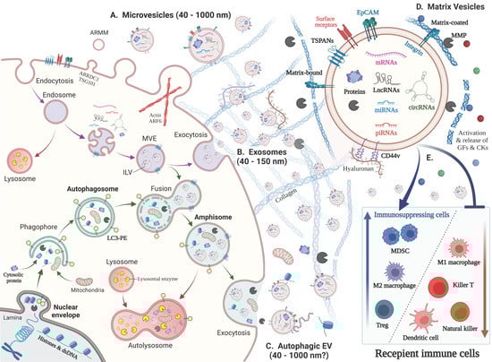 Biogenesis of various EV types and their immunoregulatory roles. (Left) Biogenesis of various EV types. (A) Microvesicles (40–1000 nm) arise from the outward budding and shedding of the plasma membrane. Small microvesicles called ARMM were recently discovered. (B) Exosomes (40–150 nm) are secreted via exocytosis of intraluminal vesicles (ILVs) by plasma membrane fusion with multivesicular endosomes (MVE) with the plasma membrane (purple arrow). (C) Autophagosome fusion with MVEs generates ‘amphisomes’, whose fusion with the plasma membrane secretes autophagic EVs and vesicle-free cytosolic and nuclear molecules, such as histones and dsDNA (green arrows). This pathway is called ‘exophagy’, a hybrid of exosomes and autophagy. Mitochondrial autophagy is called ‘mitophagy,’ which may result in the secretion of mitochondria. (Upper right) EVs contain a lipid bilayer membrane that protects encapsulated materials, such as proteins, nucleic acids, lipids, and metabolites. The EV surface contains membrane-bound and transmembrane proteins, such as tetraspanins (TSPANs: CD63, CD9, CD81, etc.) and integrins, which bind to matrix proteins. (D) ‘Matrix vesicle’ is a general term for matrix-bound vesicles and matrix-coated vesicles. MMPs cleave matrix components, such as collagen, to release EVs, growth factors (GFs), and chemokines (CKs). (E) Immunoregulatory roles of cancer cell-derived EVs. (i) The suppression and apoptosis of killer T cells, natural killer cells, and dendritic cells; (ii) activation of immunosuppressing cells, such as MDSCs and Tregs; and (iii) polarization of macrophages from the M1 to M2 type.