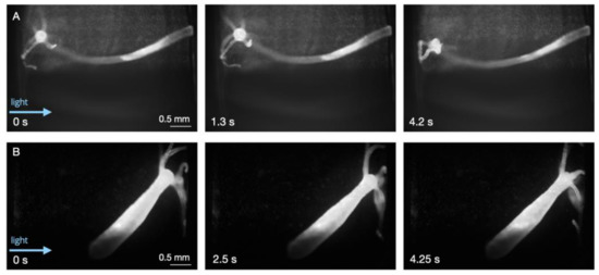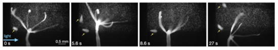 Most animals adhered to the surfaces (PDMS walls) closer to the direction of the excitation light (wavelength of 488 nm). Without flow, behaviors ranging from elongation to tentacle movement/swaying were observed (Figure 2 and Figure 3, Supplementary Figure S2, and Supplementary Video S2). Most animals would remain in an elongated or tentacle-swaying state. These observations further supported the assumptions regarding the animals’ overall health and helped demonstrate that various repertoires of the animals’ movements could be captured via the SPIM-Flow.