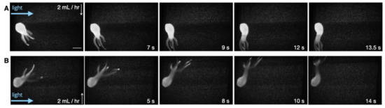 Next, taking advantage of microfluidics, Hydra’s response to flow was investigated. Hydra live in bodies of freshwater that may experience local flow due to environmental perturbations or currents (in streams and rivers). Therefore, tools to investigate their response to flow could provide valuable insights into the organisms’ biomechanical and hydrodynamic lifestyles. In their study, Badhiwala et al. [33] commented that these animals typically bend in the flow direction. We sought to investigate this observation by utilizing our larger chambers (1.6 mm in height and 4 mm wide). Our results (across four independent animals) suggested that Hydra typically respond to flow (2 mL/h) by bending and swaying their tentacles in the flow direction (tentacle-swaying in the direction of the flow (Supplementary Video S3). Reversing the direction of flow also resulted in Hydra redirecting accordingly (Figure 4). The results also suggested that the animals could immediately respond to the flow initiation via rapid contraction or tentacle-swaying in the direction of the flow (Supplementary Figure S3).