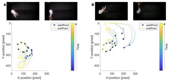 Next, two previously described image analysis approaches were used to examine the animals’ responses to flow closely. First, to track the movement of the animals, a markerless pose estimation software (i.e., DeepLabCut2.0) was used [42]. To this aim, locations on the body and the tentacles were identified across video recordings. Utilizing DeepLabCut, the movements of these positions were tracked to generate 2D skeletons of the animals (tentacle-swaying in the direction of the flow (Supplementary Video S4) and plots detailing the changes in the positions of previously identified locations (Figure 5). In the tracking plots, squares represented the starting position, and the triangle represented the final positions for a given body part. The color map indicates the movement of the marker through time (as demonstrated from the first and last frame of the video). Pose estimation software provided opportunities to analyze the results from the SPIM-Flow system experiments. Next, a previously described flow visualization algorithm (i.e., FlowTrace) was used to better visualize the flow features (primarily due to external flow) from the SPIM-Flow recordings. FlowTrace is a simple algorithm that enables the extraction of flow features from videos [43,44]. Unlike typical pipelines for particle image velocimetry, FlowTrace is not computationally taxing. Here, the algorithm was used a FIJI plugin. Therefore, a rapid analysis could provide critical hydrodynamic insights from the SPIM-Flow recordings. The results for these visualizations are provided in Supplementary Figure S4 and Video S5. The videos include both the original recording and the pathline visualizations.