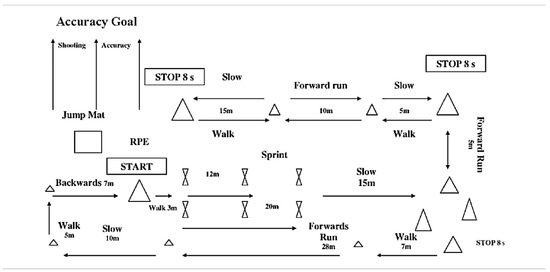 The BEAST90 is shown in Figure 1. It was chosen because it has been shown to be a valid and reliable simulation of the game; with less than 3% error of measurement for heart rate, sprint times and circuit times [22]. Specifically, the test consists of circuits during two 45-min halves, with 15-min rest in between. The circuits include 12 m and 20 m sprints, running at approximately 75% of maximal speed, jogging, decelerating, backwards jogging, kicking a football, walking and side stepping between cones [22]. Between each circuit, participants did three countermovement jumps (CMJ).