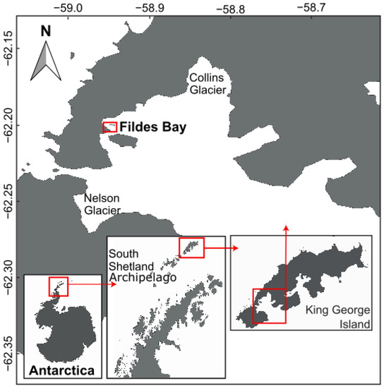 Location of the study area (approximately 62.20° S, 58.95° W) in Fildes Bay on the coast of King George Island in the northern region of the South Shetland Archipelago.