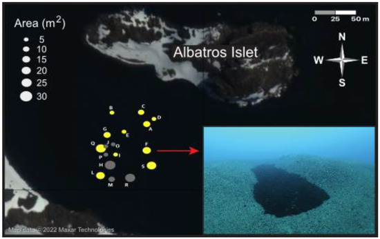 Distribution and size of the 17 ice pits documented in 2018. Algal biomass and composition were sampled with quadrats in eleven ice pits (yellow shapes). Ice pits were distinguished from the surrounding soft sediment seabed by distinct algal deposits within depressions (inset photo).